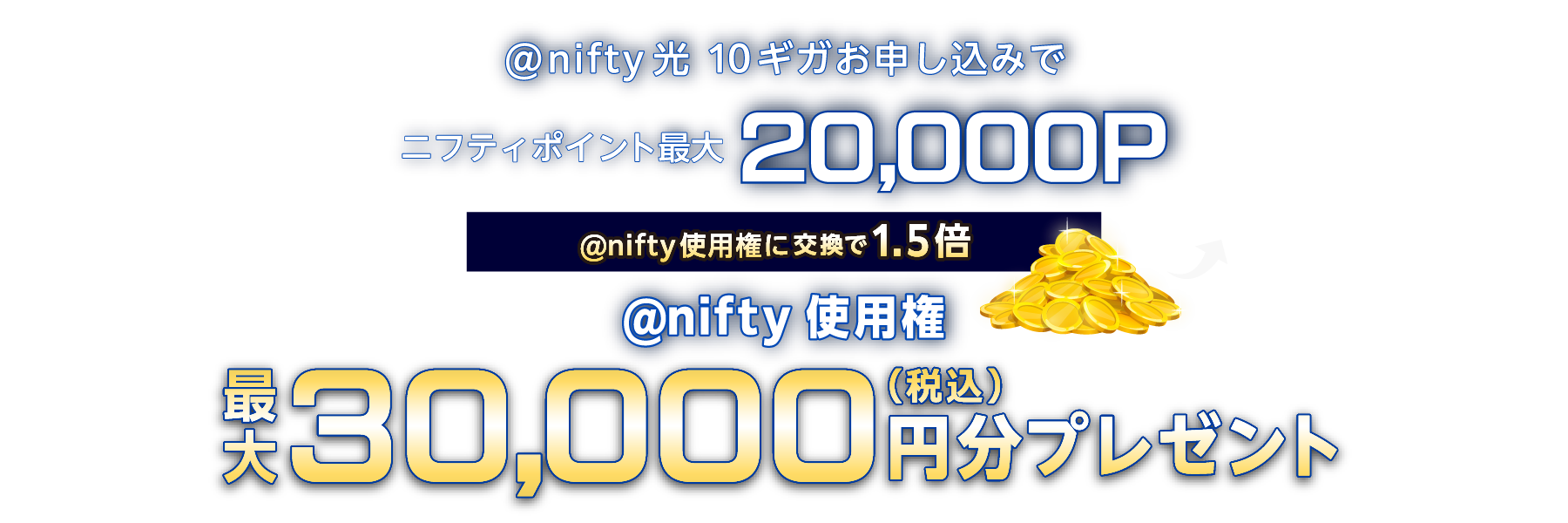 - ※@nifty光 10ギガ 申込特典のニフティポイントは付与月の1日に付与されます。ニフティポイントの付与状況はニフティポイントクラブの通帳でご確認いただけます。ニフティポイントが正常に付与されなかった場合、@nifty入会時に発行されたメールアドレス宛に再適用に関するご連絡をいたします。再適用の手続き期限は付与月の20日までとなりますのでご注意ください。