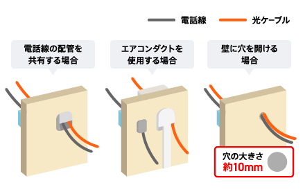 住宅内への光ファイバーケーブルの引き込みは電話用の配管かエアコンダクトを利用して行われるケースが多いですが、お客様の住宅状況により壁に約10mm程度の穴を開けて引き込みが行われるケースもあります。