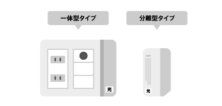 光コンセントには壁に設置する一体型タイプと壁からケーブルを出して繋ぐ分離型タイプの2種類があり、お客様の住宅状況に合わせたどちらかのタイプを設置します。