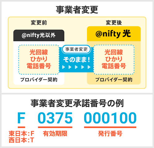 事業者変更承諾番号とは、現在ご利用中の光コラボレーションを別の事業者に変更するために必要となる番号です。 お客様ご自身で現在ご利用中の光コラボ事業者に連絡し、事業者変更承諾番号を入手してください。