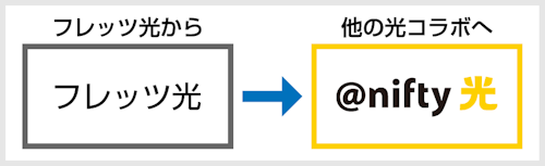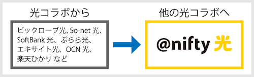 例えば、ソフトバンク光やドコモ光といった光コラボから、同じく光コラボの@nifty光に乗り換える場合は「事業者変更」となります。